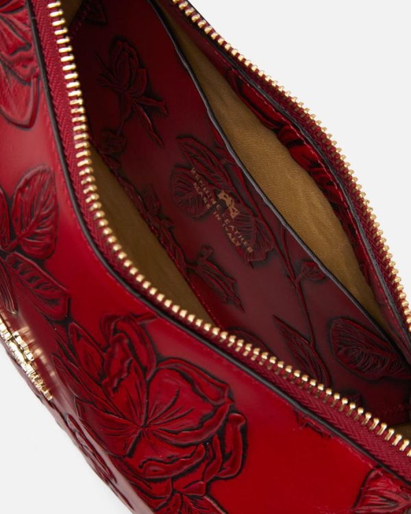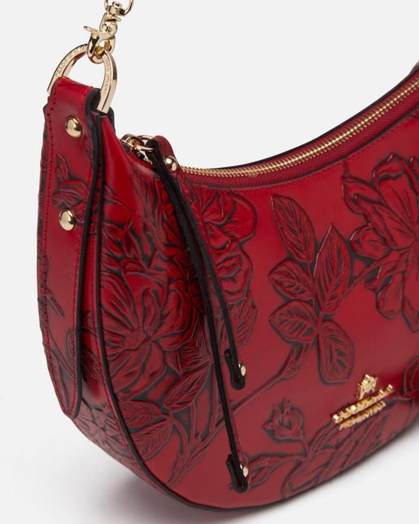 The ideal bag for those who want the moon! The small hobo Eva, with its delightful half-moon shape, can become intriguing and cheerful with its golden chain and extremely comfortable with its adjustable shoulder strap. The small but ample space inside and a 13-tiered workmanship to create unique roses make her the perfect friend on shopping days in the city centre but a chic addition to the most elegant dinner parties. An explosion of style.