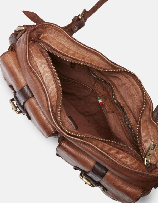 This leather is made with a very complex and difficult treatment. It begins with a skin called CRUST. Each bag is first completely assembled, followed by a dye bath during which it loses 30% of its volume. The bags are then laid out and dried slowly in the open air, then treated one by one by hand with a natural beeswax. This last step gives the product an unmistakable softness and a beautiful aged effect. This type of processing is 100% environmentally friendly and metal free.