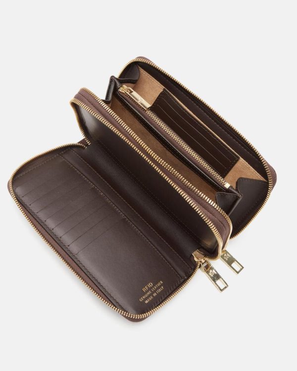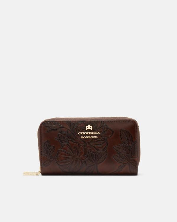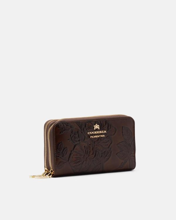 The double-zip wallet combines gold metal details with the brand’s signature floral rose design. Two separate compartments offer ample space to store credit cards and documents, as well as numerous pockets and compartments for banknotes. Combined with the iconic Cuoieria bag, it becomes a perfect glam accessory.