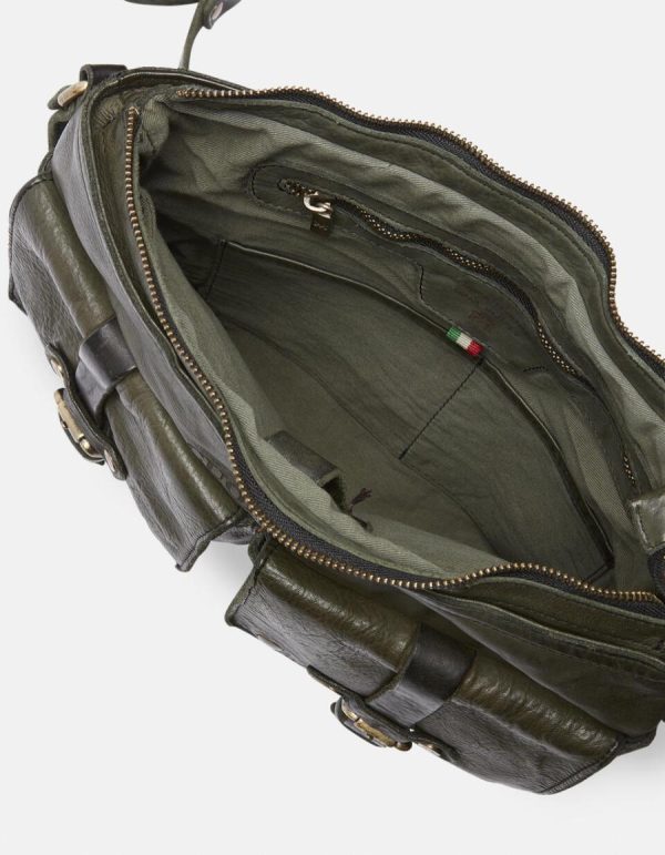 This leather is made with a very complex and difficult treatment. It begins with a skin called CRUST. Each bag is first completely assembled, followed by a dye bath during which it loses 30% of its volume. The bags are then laid out and dried slowly in the open air, then treated one by one by hand with a natural beeswax. This last step gives the product an unmistakable softness and a beautiful aged effect. This type of processing is 100% environmentally friendly and metal free.