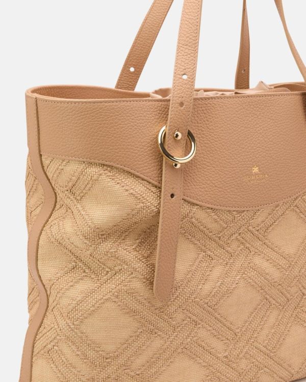 Refined natural-effect rafia with contrasting central detail in soft first-grain calfskin.
