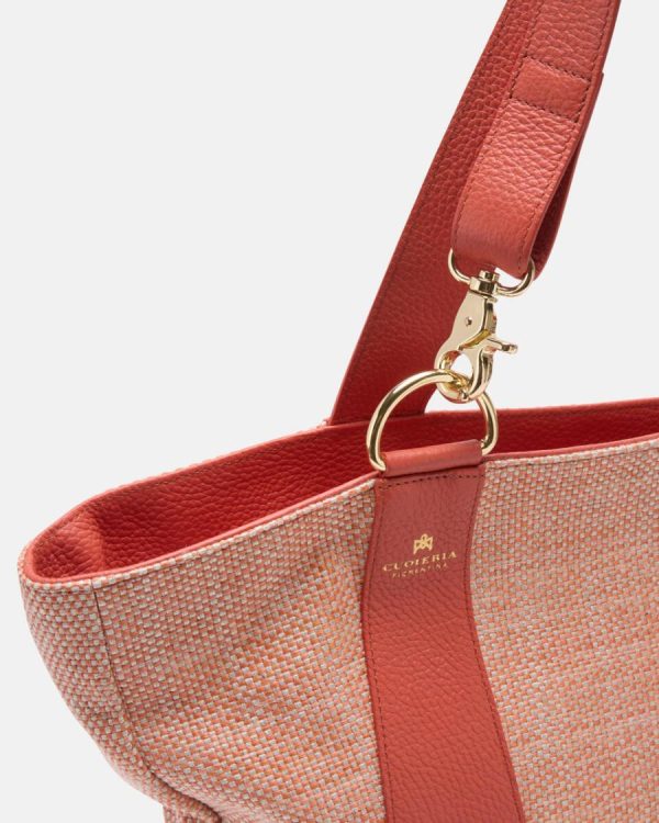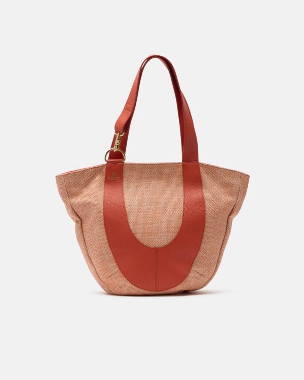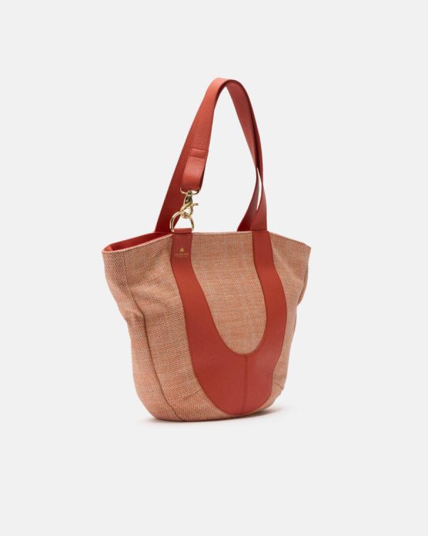 Jacquard fabric made from a mix of cotton, linen and raffia, with a consistent and rich weave in neutral colours, for everyday wear. The details are made of full-grain leather.