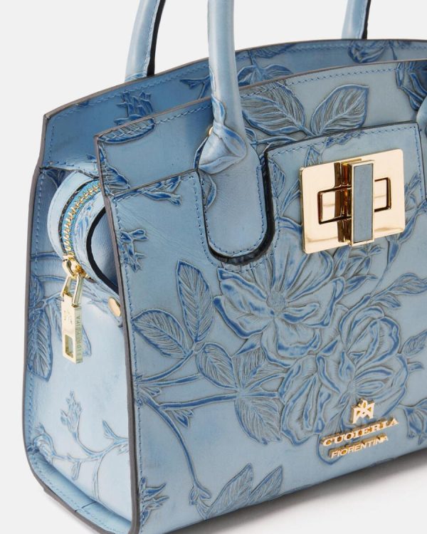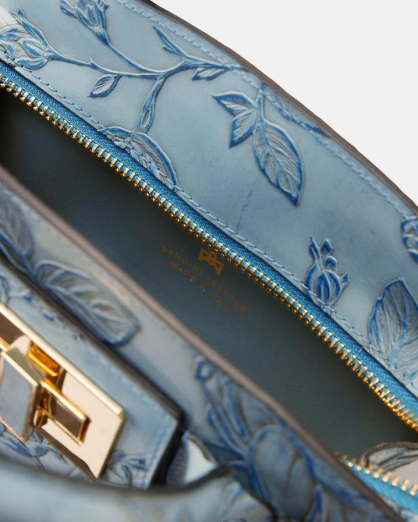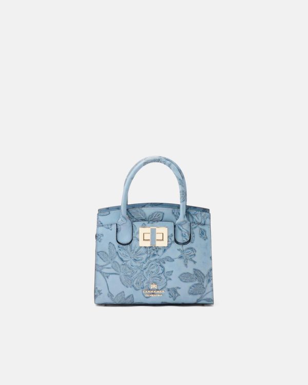 Mimi represents a true style icon and represents a worldwide exclusive of the brand. The peculiarity is contained in the long articulated process consisting of over 13 processing steps of the floral motif. Not only calfskin, but a true artwork, expertly hand-painted on different levels. The end result is a unique material of its kind, with which small masterpieces are made.