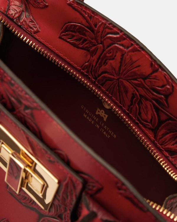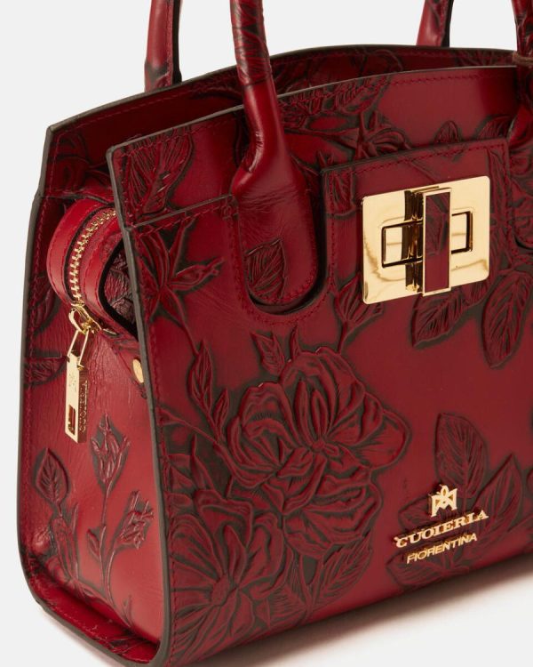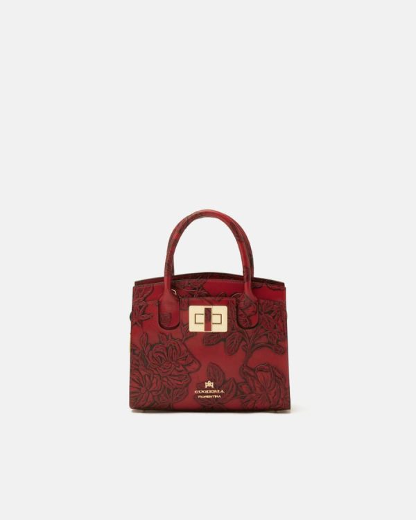 Mimi represents a true style icon and represents a worldwide exclusive of the brand. The peculiarity is contained in the long articulated process consisting of over 13 processing steps of the floral motif. Not only calfskin, but a true artwork, expertly hand-painted on different levels. The end result is a unique material of its kind, with which small masterpieces are made.