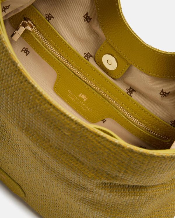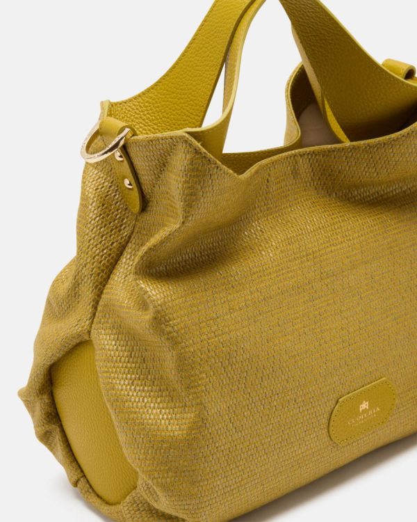 Refined raffia made from a weave of cotton and linen threads and details in soft first-grain calfskin.