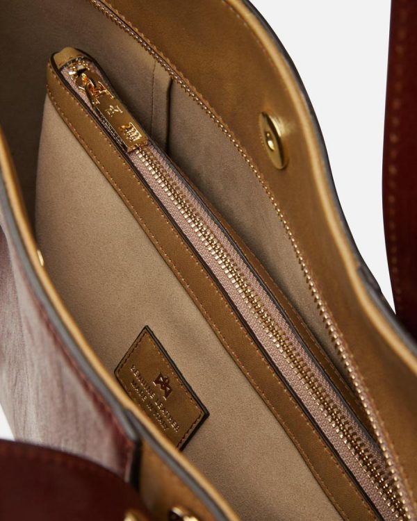 The vegetable-tanned calf is subjected, while still wet, to a particular process that gives it an worn and wrinkled effect enhances. The leather is rolled up and squeezed, then left to dry for 6 weeks, then is opened and buffed by hand to obtain the dark-light effects. The wringings remains etched on the skin forever. This tanning is 100% ecological and metal free.