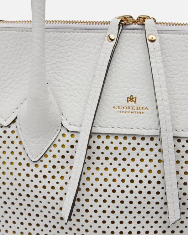Experience the perfect blend of elegance and functionality with this stunning tote bag. Featuring beautiful golden accents and a vibrant yellow interior, this perforated leather bag transitions seamlessly from professional settings to social gatherings. Its sophisticated design makes it the ideal companion for both work and leisure occasions.